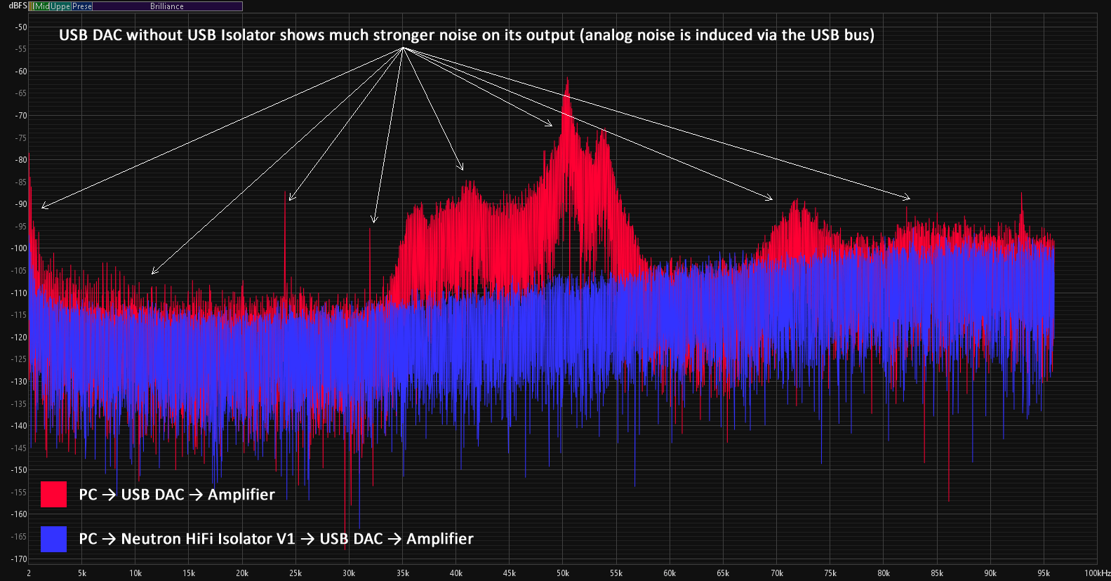 By isolating the ground between the PC and the DAC/DAP, Isolator V1 prevents analog noise — including ground-loop hum — from entering the audio signal, resulting in a cleaner, more accurate audio spectrum.